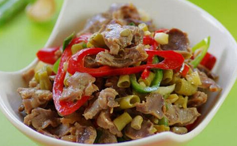4、加入腌制好的雞胗,炒至變色后,加入酸豆角。