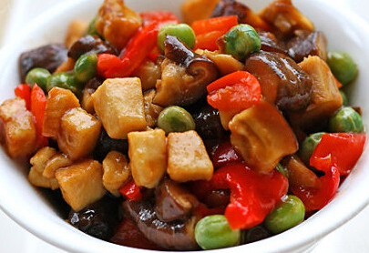 5.將雞丁盛起,扒雞肉的油留在鍋中,依次下入紅椒丁、青豆、香菇丁爆炒;