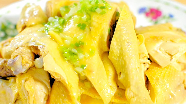 6、將雞從冰水里撈出控干水分切塊,吃前蘸蔥油味汁即可。