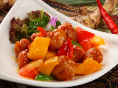 3、鍋內(nèi)留少量油,放入蒜泥煸香,加青椒片、胡蘿卜片略炒,放入糖醋汁,燒開后用淀粉勾芡,倒入肉丁,淋明油,出鍋裝盤。