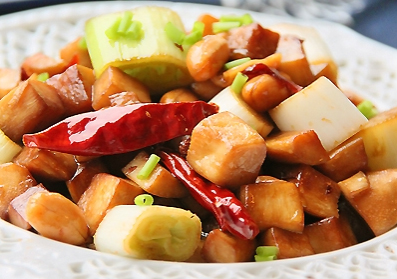雞胸肉、大蔥、花生米、干辣椒、花椒、姜、蒜、食用油適量、糖、鹽、醋、淀粉、水、老抽適量