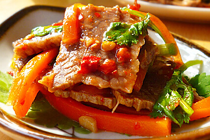 材料:牛肉 (適量)、胡蘿卜 (適量)、香菜 (適量)、辣椒醬 (適量)、料酒 (適量)、麻油 (適量)