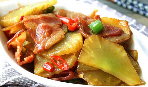 3、加入培根片,翻炒至出油兒后,稍有抽縮的狀態(tài);