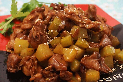 8、等兔肉都進(jìn)味后加入青筍,翻炒半分鐘,最后撒上白芝麻即可。