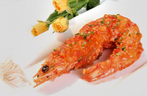 3、倒去鍋中余油,下豆瓣醬,炒出紅色,再下板油丁、姜、蒜丁,炒香后加湯,放蝦、醬油、料酒、味精,燒透入味,下蔥花、醋,將汁收干亮油裝盤,豌豆尖洗凈炒熟,放在大蝦面上即成。