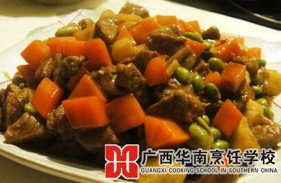 3、下油2湯匙,放下牛腩、蒜茸爆香,下酒1湯匙,再下潮州豆醬炒勻,加入調味煲滾,小火燜爛(約需30分鐘),用生粉水勾芡,下蔥炒勻即可。
