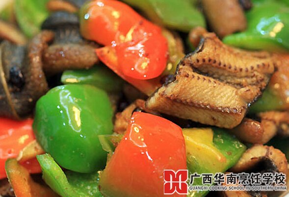5.將鱔片炒至八成熟時,加入炒好的青紅椒一起翻炒均勻,加入少許生抽即可。