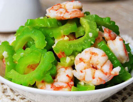 5、起植物油鍋,小火炸香花椒,去掉花椒,把花椒油趁熱澆在拌好的苦瓜蝦仁上,拌勻即可。