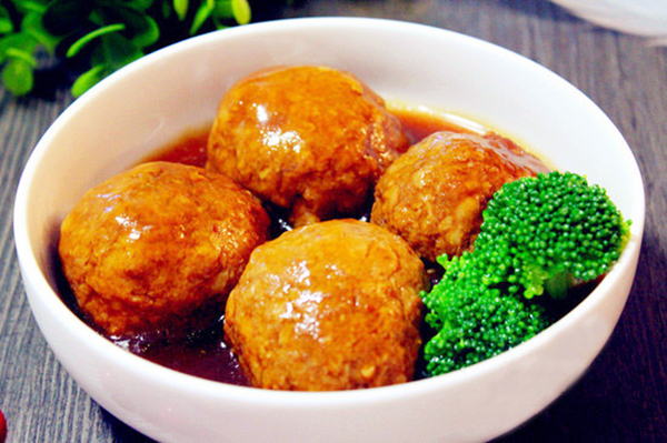 紅燒獅子頭,也稱四喜丸子,是取其吉祥之意。這是一道淮揚(yáng)名菜,是中國逢年過節(jié)常吃的一道菜,有肥有瘦的肉紅潤油亮,配上翠綠青菜掩映,鮮艷的色彩加上撲鼻的香味,光看就引動食欲,醇香味濃的肉塊與汁液,是令人無法抵擋的頂級美味。