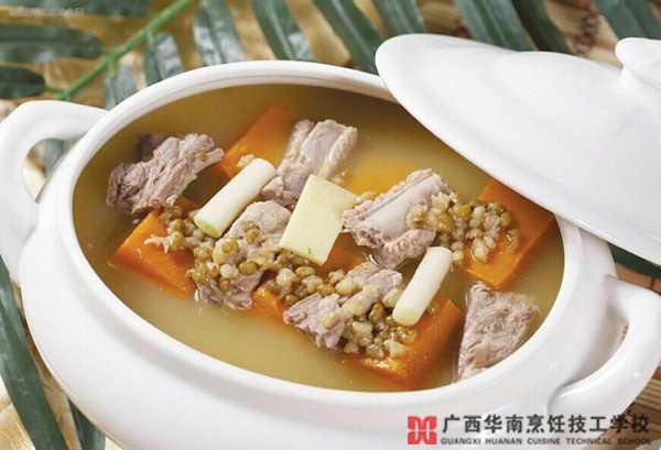 食材:豬排骨(大排)100克、南瓜200克、綠豆20克、鹽適量