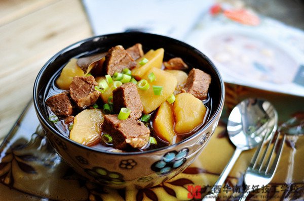 3.另起油鍋下1中的牛肉塊炒,加入土豆和清水沒(méi)過(guò)牛肉,燒開后轉(zhuǎn)小火慢燉1-2小時(shí)至牛肉酥軟、土豆熟透,加入食鹽和胡椒粉調(diào)味即可。