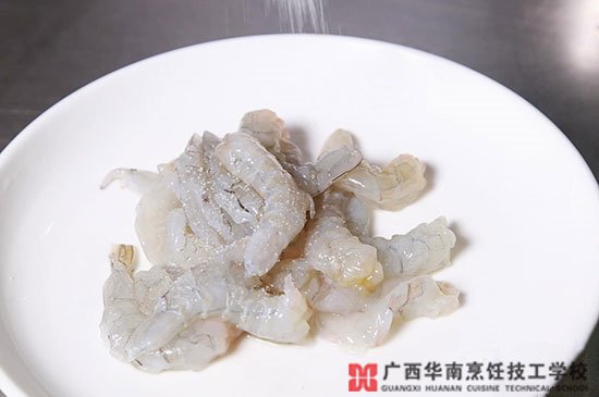 工藝流程:1.將鮮蝦去蝦線,加入鹽、雞精、蛋清、生粉、料酒腌制上漿;
