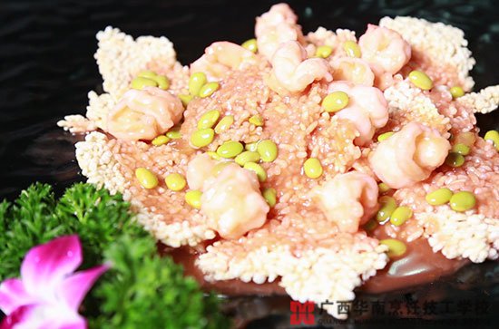 主配料:鮮蝦仁、鍋巴、西紅柿、毛豆;
