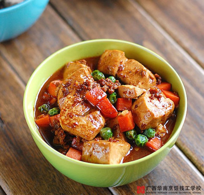 原料:老豆腐;牛里脊;胡蘿卜;豌豆;蒜末;姜末,調(diào)料:料酒;生抽;老抽;鹽;糖;