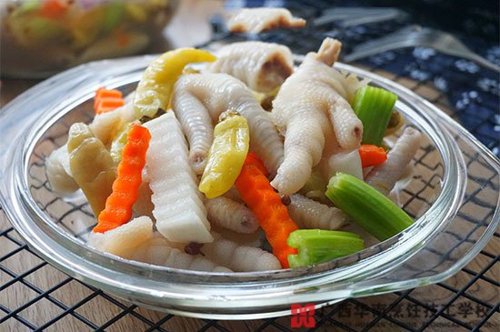 6、將調配好的鹵水倒入沖干凈膠質的雞爪中浸泡2小時。