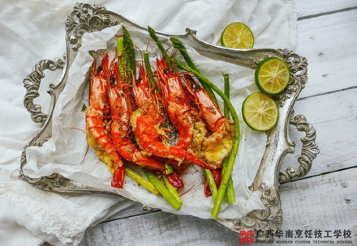 材料:海蝦、蘆筍、檸檬、黑胡椒、海鹽、橄欖油、蒜、干百里香碎