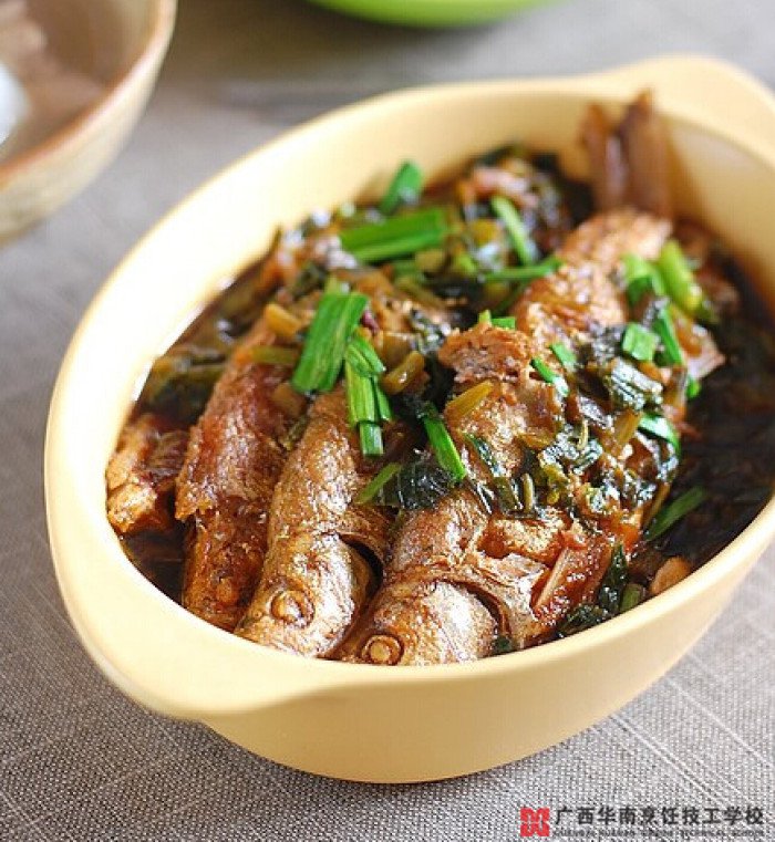食材:餐條魚(yú)、雪菜、淀粉、姜蒜、料酒、生抽、老抽、糖