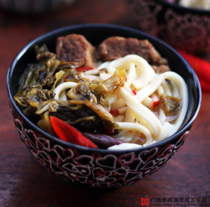 6、面條煮熟,撈出澆上酸菜和牛肉,在澆適量燉牛肉酸菜的湯即可。