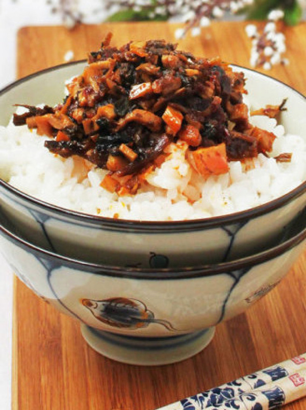 材料:梅干菜、五花肉、竹筍、色拉油、生抽、拌飯醬。