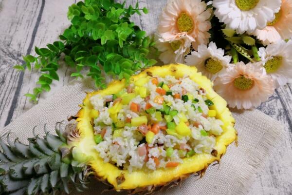 主料:菠蘿半個、剩米飯1碗、胡蘿卜1小段、黃瓜半根、火腿2片。