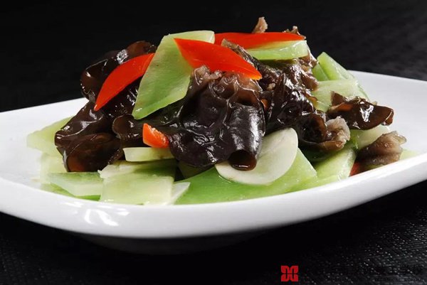 青筍500克、木耳150克、紅椒20克、姜15克、油適量、鹽1茶匙、糖半茶匙、生粉1茶匙