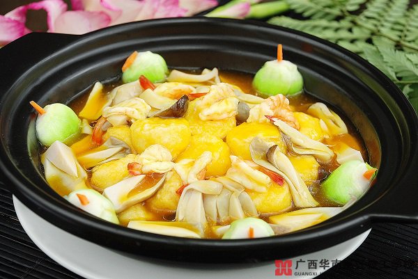 6、準備好砂鍋煲,倒入煎好的玉子豆腐,放入蝦仁和蔬彩粒加入適量水煮沸騰,再加入少量的調(diào)味料關(guān)火即可享用。