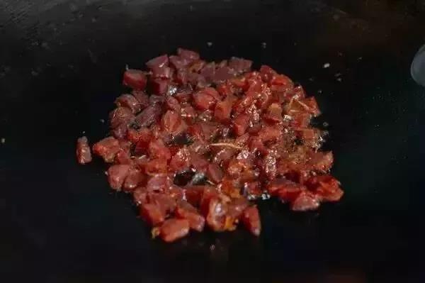 1.熱油下鍋,把臘腸切丁后放入鍋里,煎熱2分鐘。