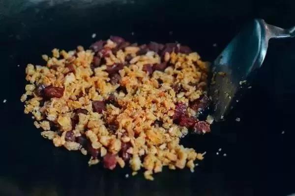 2.干蝦仁切碎后倒入臘腸里,攪拌一分鐘,盛起裝碗里備用。