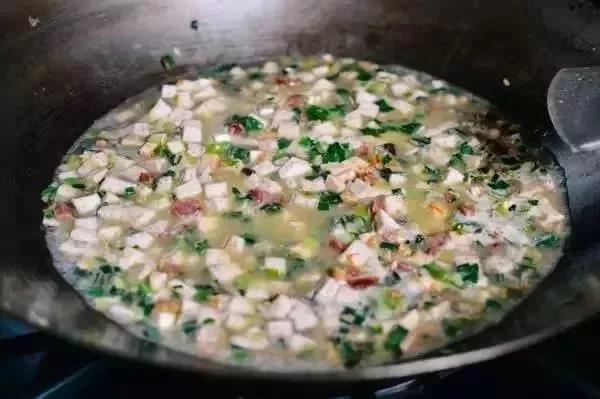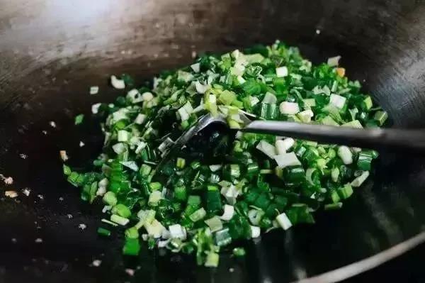 3.趁著鍋的余熱倒入蔥花,把切好芋頭、臘腸干蝦倒入,撒兩勺鹽,一并炒熟。