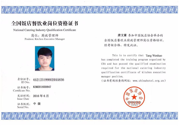 證書全國(guó)統(tǒng)一編號(hào)、統(tǒng)一注冊(cè),可在中國(guó)飯店協(xié)會(huì)官網(wǎng)查詢。