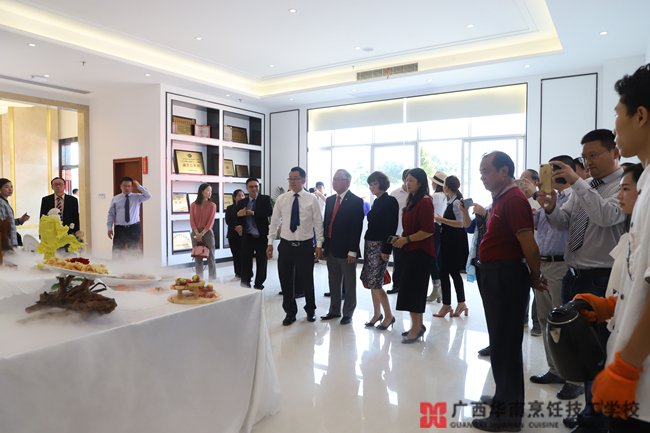 安徽長(zhǎng)安開(kāi)元投資集團(tuán)副總經(jīng)理?xiàng)詈瓯瑥V西華南烹飪技工學(xué)校校長(zhǎng)翟維鐵,南寧優(yōu)美西點(diǎn)學(xué)校校長(zhǎng)趙志權(quán),南寧市百美匯美容美發(fā)彩妝學(xué)校校長(zhǎng)王勇,中國(guó)元老級(jí)中國(guó)烹飪大師何逸奎,廣西人力資源和社會(huì)保障廳職業(yè)能力建設(shè)處處長(zhǎng)楊春華、技工教研室主任覃朝俊,泰王國(guó)駐南寧總領(lǐng)事館總領(lǐng)事蔡樂(lè)蓬蒂窩拉衛(wèi)、領(lǐng)事吳萬(wàn)雅,泰國(guó)川登喜國(guó)際烹飪學(xué)校校長(zhǎng)塔南帕,馬來(lái)西亞成功禮待大學(xué)院長(zhǎng)黃志強(qiáng)、執(zhí)行董事何淑娟,中國(guó)烹飪協(xié)會(huì)副會(huì)長(zhǎng)曾大文、西園鑒定所所長(zhǎng)林海妮,陽(yáng)光藥業(yè)董事長(zhǎng)黃大權(quán)等領(lǐng)導(dǎo)嘉賓以及廣西各大媒體記者共同出席了新校區(qū)啟用儀式。