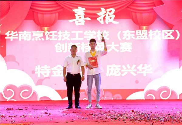 是不是很多同學(xué)還沉浸在國慶假期的歡樂情緒當(dāng)中?就在上個月底學(xué)校舉辦的國慶迎新晚會上,除了歡歌笑語的表演外,還進行了2021年創(chuàng)新桂菜校園烹飪大賽的頒獎儀式,而今天話題的主角,就是大賽特金獎的獲得者,是今年17歲的龐興華。