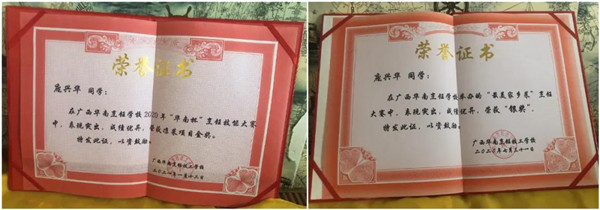 很多新生剛進來懵懵懂懂,只有一腔對烹飪的喜愛,而龐興華卻表示,在他剛?cè)雽W(xué)不久,基礎(chǔ)還不算特別扎實的時候就開始參加比賽,“重在參與”一詞是對當(dāng)時的他最好的詮釋。而經(jīng)過一年多的成長,他已大有進益,這位“低調(diào)的學(xué)霸”溫和而真摯地說這并不是他第一次獲得獎項,在“華南杯”烹飪技能大賽、最美家鄉(xiāng)菜、精美涼菜爭霸賽等比賽中都取得了不錯的成績。