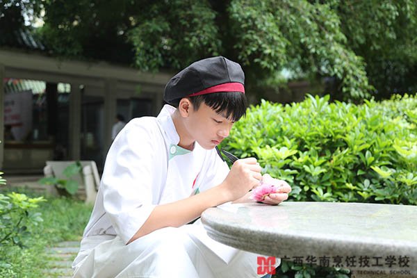 覃生榕喜歡學(xué)熱菜和雕刻,盡管對雕刻不是很擅長,但他卻不怕困難,他說到:“堅持下去,不會的也要學(xué)。”來到廣西華南烹飪學(xué)校,他表示學(xué)到了很懂以前不懂的東西,自己的技術(shù)和心態(tài)都得到了提升,這也是一個成長的過程。