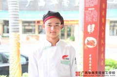 清秀的濃眉下,一雙深邃的眼眸泛著鏈漪,靦腆地一笑更是給他陽光的形象增添了一抹帥氣。這位97后高顏值小鮮肉,踏著堅定的步伐,來到了廣西華南烹飪技工學校。 在18歲他的心中,成為一名廚師,不是一天、一個月、一