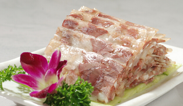 做法:1.羊肉洗凈,用水浸泡2~4小時,切大塊,開水焯一遍,撇去浮沫;2.將羊肉塊、豬皮、白蘿卜一起放在鍋中,加清水燒開后撈出;3.將羊肉、豬皮放到盤中,加入料酒、蔥姜、胡椒花椒粉等拌勻,入鍋隔水大火蒸2小時左右,待羊肉酥爛撈出平碼盤中;4.繼續(xù)蒸豬皮,直到豬皮全部糊爛,撇凈湯汁浮油和撈出沒有蒸化的皮;5.澆入羊肉盤中晾涼,放入冰箱冷凍,待晶瑩透亮的糕狀形成后取出,切成長條塊,即可裝盤食用。
