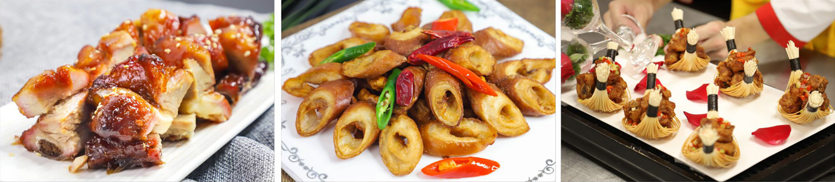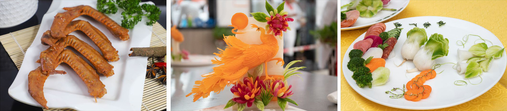 | 技能拓展 | 流行川湘粵菜:學(xué)習(xí)粵式白切雞、魚頭豆腐湯、白灼鴨胗、蟲草花蒸全雞、菠蘿咕嚕肉等; 熱門川湘粵菜:黑椒牛仔骨、鮑魚扣飯、仔姜炒鴨、孔雀開屏魚、木桶豬手等; 潮州鹵水:鹵水調(diào)制及市面爆款鹵味制作; 食品雕刻與拼盤:海南風(fēng)光、迎客松、步步高升等食品拼盤等; 階段考核:考驗(yàn)學(xué)生對本階段學(xué)習(xí)菜品的掌握程度。 |