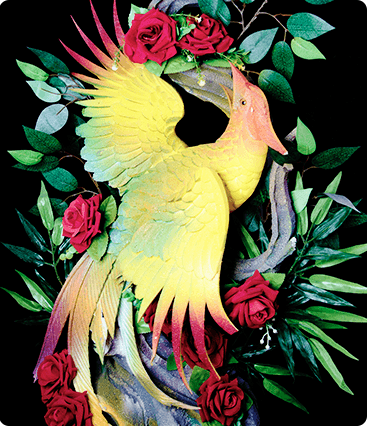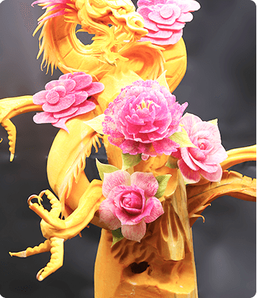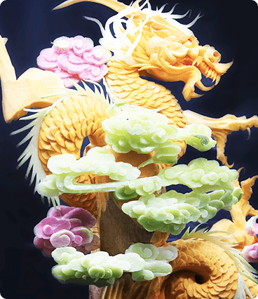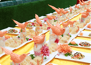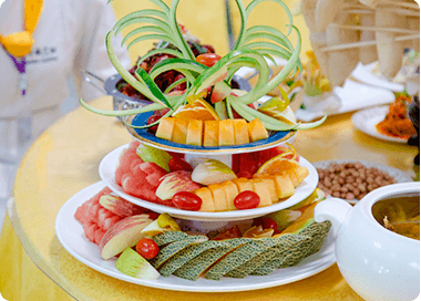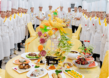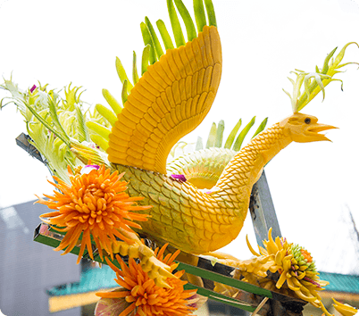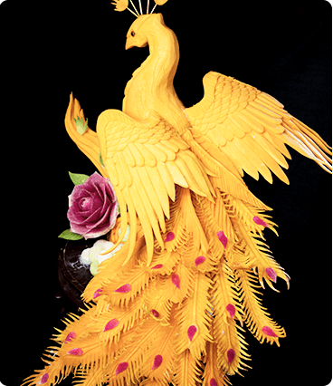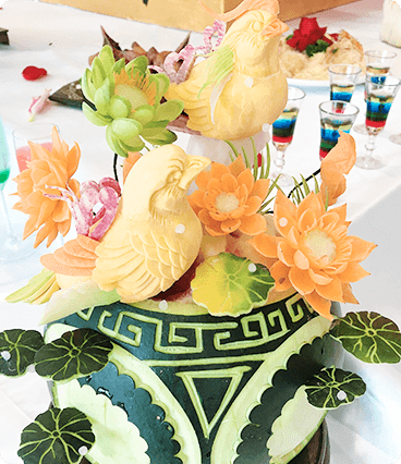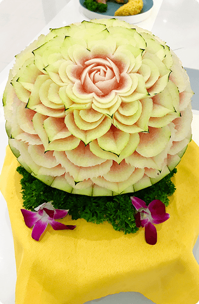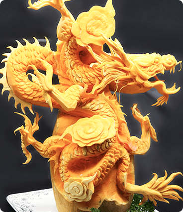 果蔬雕刻,又稱餐桌上的藝術(shù)。以常見的蔬菜、瓜、果為原料,通過切、旋、削、戳、刻等手法,把它變成玲瓏剔透、 栩栩如生的花卉、走獸、人物、風(fēng)景,化平凡為神奇,使得大宴小酌面目一新,給人一種充滿情趣的餐飲氣氛。